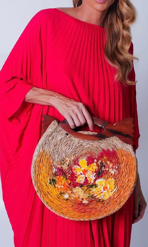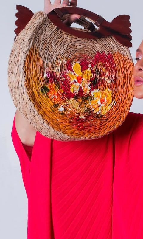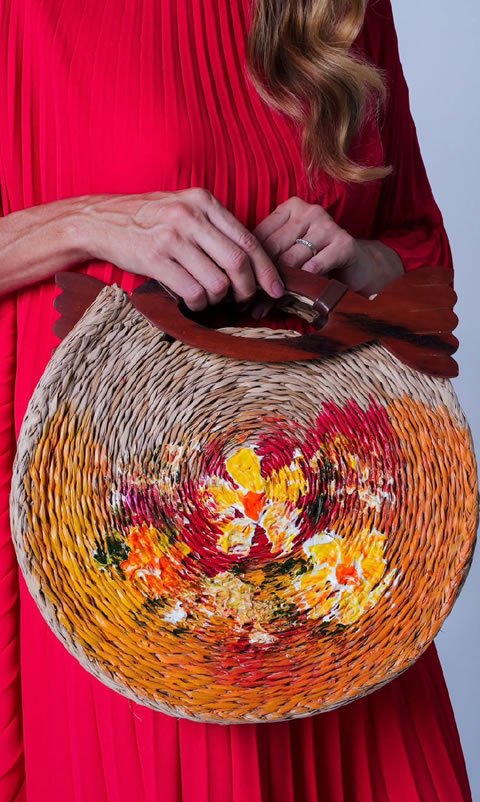 Bolsa ANA , tecida em fibra de taboa pelas artesãs de Feliz Deserto, modelo arredondado com alças em formato de peixe esculpido em madeira. Flores pintadas por Walbia, artista carioca.