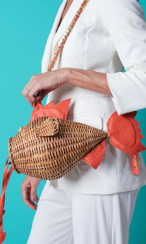Bolsa BAIACU, Confeccionada com cipó dos rios da Região Centro-Oeste, em formato de peixe.