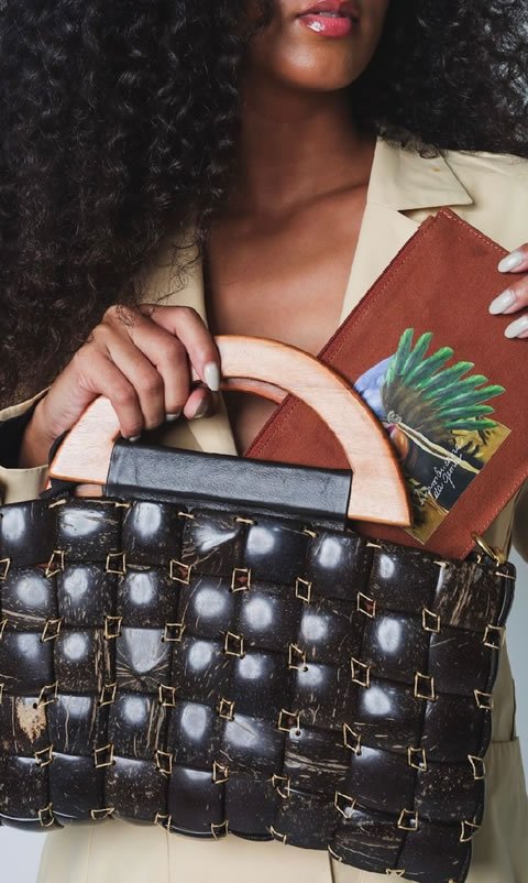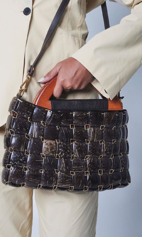 Bolsa DANDARA em versão coco. Produzida com placas da madeira do coco cortada em pequenas faces unidas artesanalmente por fios encerrados.