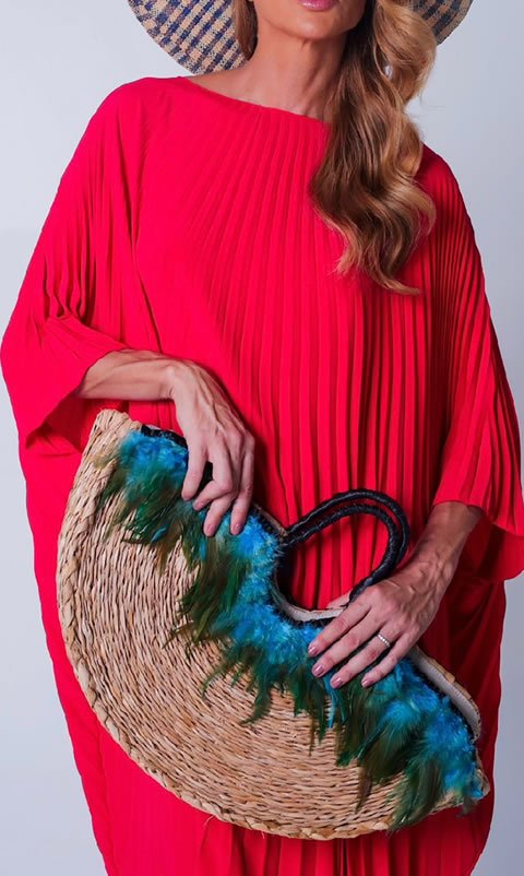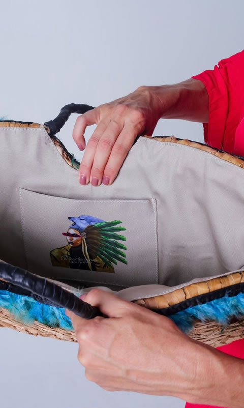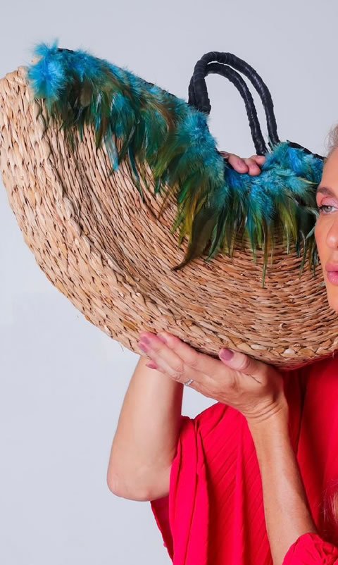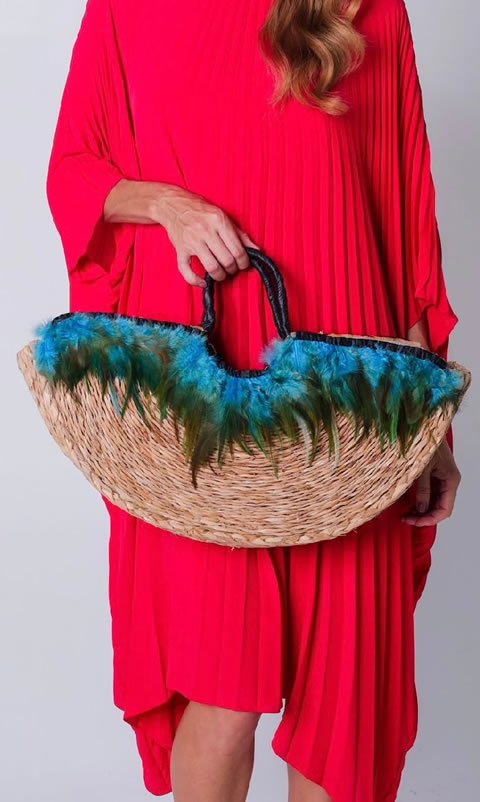 Bolsa LUA BONITA, tecida em fibra taboa pelas artesãs de Feliz Deserto, acabamento em couro finalizado com penas de ganso com tingimento natural.