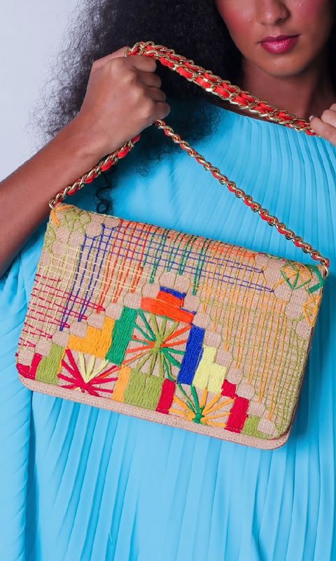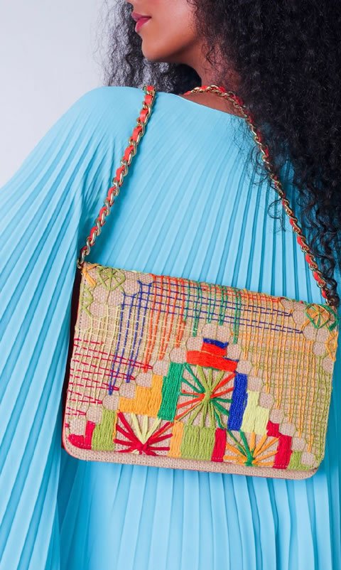 Bolsa PETRUCIA, nome dado em homenagem a renda filé do Pontal da Barra, em Maceió, um bordado artesanal tradicional de Alagoas, reconhecido como patrimônio cultural e cujos desenhos que se assemelham a uma pintura, foram criados por Petrucia, tradicional artista/Rendeira que fez teceu exclusivamente para a marca . Acabamento em couro. Alças em correntes cor ouro. O filé utiliza redes de pesca adaptadas para criar peças coloridas e vibrantes, razão de nossa inspiração.