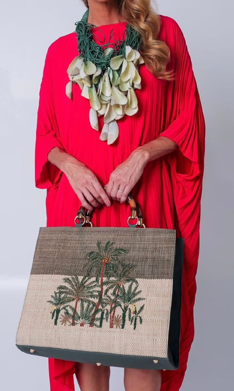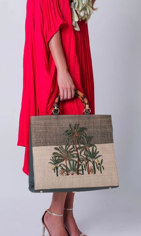 Bolsa RESORT – Coleção Crivo . Palha natural bicolor com tingimento natural. Bordados com figuras de coqueirais . Tamanho G – 50×50